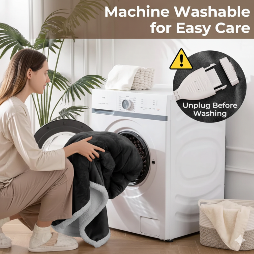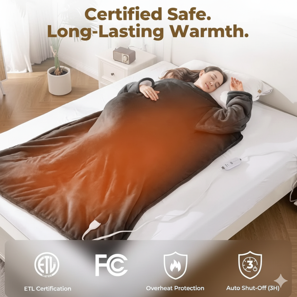 The design is simple: premium ultra-soft fabric + even heat distribution + heated foot pockets + wide arm sleeves + machine-washable construction + safety-tested technology. That's it.